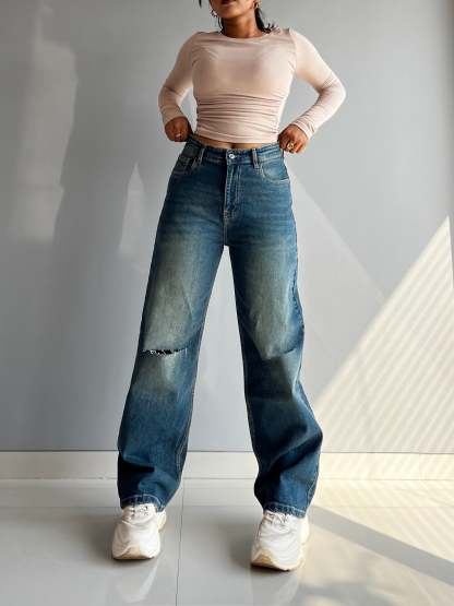 Our 90's Blue Ripped Baggy fit Jeans are perfect for any occasion. Designed with stretch denim for an extra comfortable fit, these jeans will be your go-to for everything from weekend wear to a night out. Get your pair now.